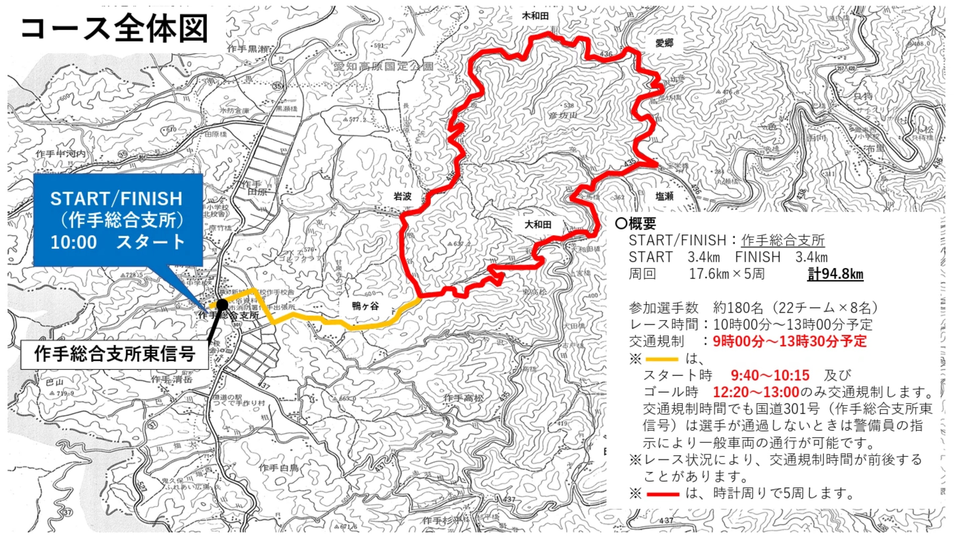 - ※黄色ラインは、スタート時 9:40~10:15 及びゴール時 12:20~13:00のみ交通規制します。交通規制時間でも国道301号(作手総合支所東信号)は選手が通過しないときは警備員の指示により一般車両の通行が可能です。