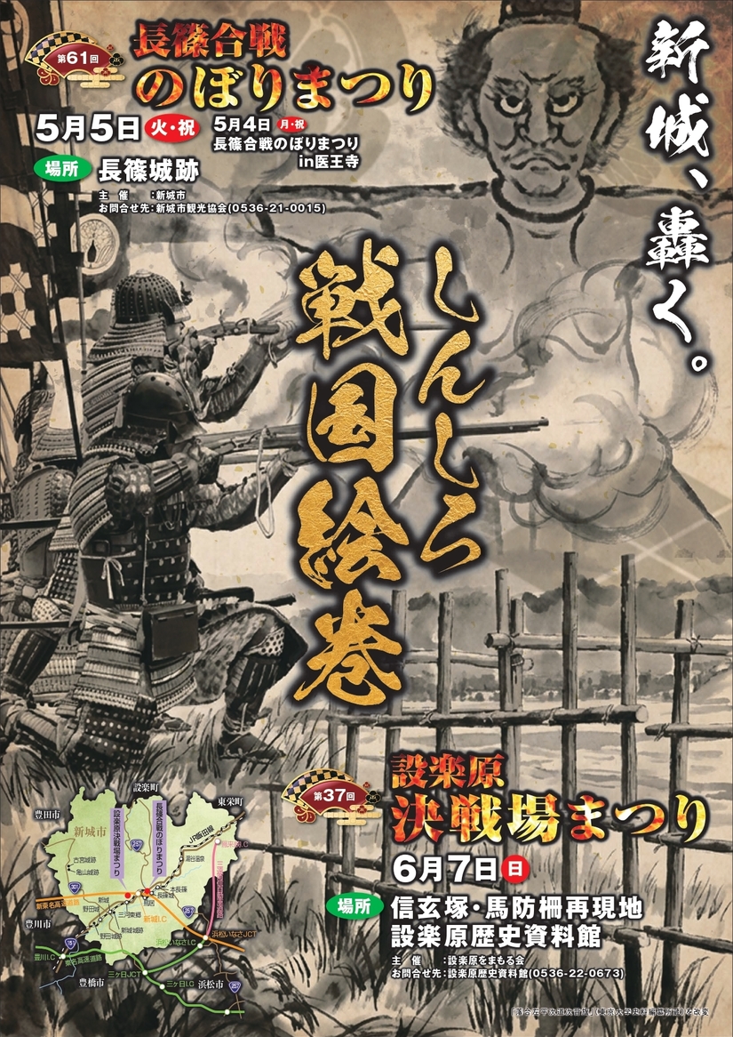 本まつりは、その舞台となった長篠城址において開催されます。 当時、長篠城主の奥平貞昌は、わずかな兵で籠城し、厳しい戦況の中、鳥居強右衛門勝商らの命がけの働きにより援軍を呼び込み、戦局を大きく動かしました。 まつりでは、法要のほか、合戦行列、火縄銃演武、長篠陣太鼓演武、弓の演武などが行われます。