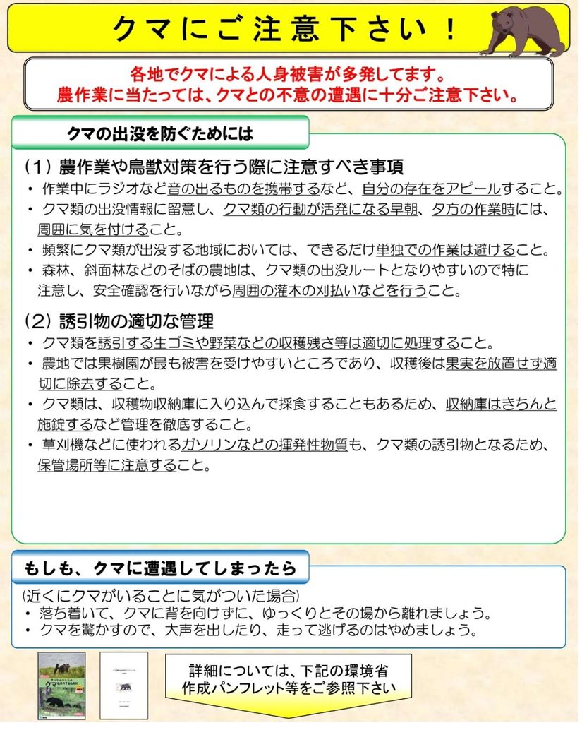 - 小グマを見かけた場合は特に注意。 近くに親グマがいる可能性が高く、大変危険です。速やかに離れてください。